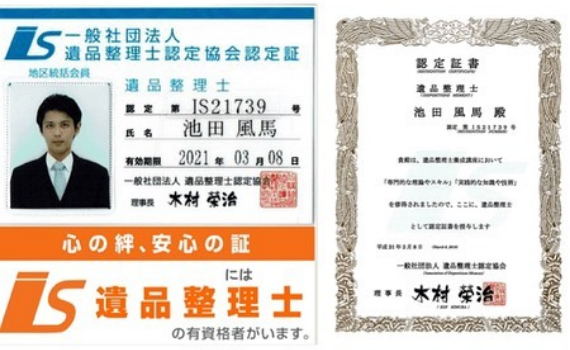 スターチス代表の池田は遺品整理とは何かを学び、遺品整理士認定協会により遺品整理士としての資格を与えられた、言わば人助けのエキスパートです。