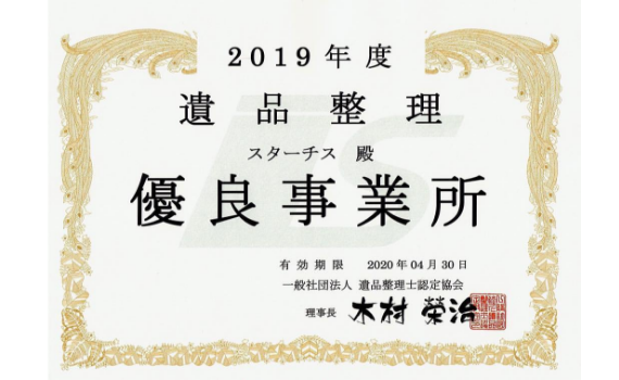 スターチスのスタッフは遺品の取り扱いを心から理解し、お客様、故人様に安心して利用していただける事業所である事から優良事業所であると認められています。