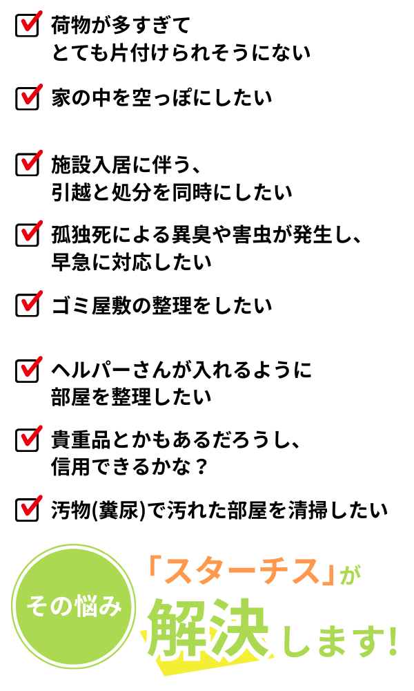 不法投棄、貴重品の紛失、物品の粗暴な扱い、見積金額の追加料金は一切いたしません。